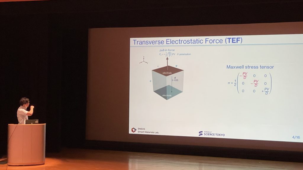 「強誘電性ネマチック液晶における電界垂直方向のMaxwell応力を利用した強誘電モーターの開発」の発表を行う塚本さん。